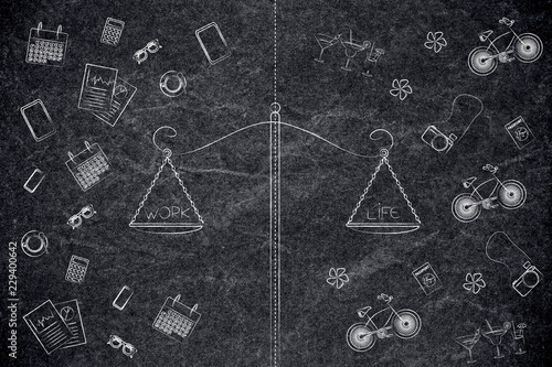scale with dashed line dividing work and life balance with both being in equilibrium and surrounded by icons