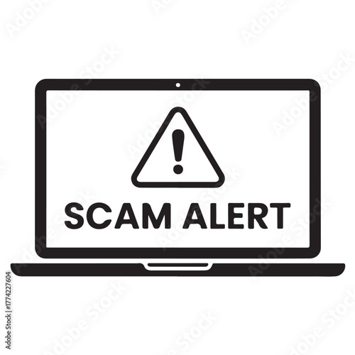 Scam alert on laptop screen vector illustration of a warning sign on a computer isolated on white background
