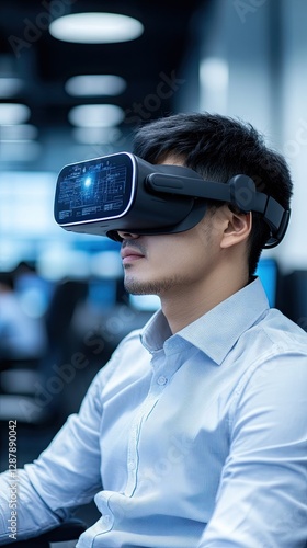 Scandinavian office A focused individual wearing virtual reality headset in a modern office environment.