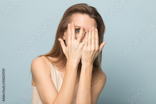 Scared young woman hiding behind hands, peeping through fingers