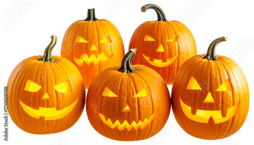 Scary Halloween jack-o'-lantern with a creepy carved smile on an orange pumpkin isolated on white background.