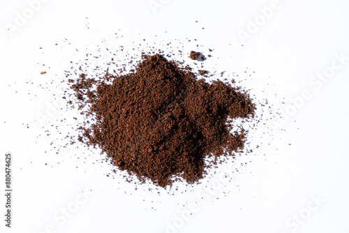 Scattered ground natural coffee on white background, top view.