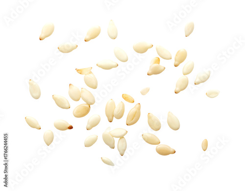 Scattered sesame seeds against a stark black backdrop, showing textures & forms with bright highlights on each seed