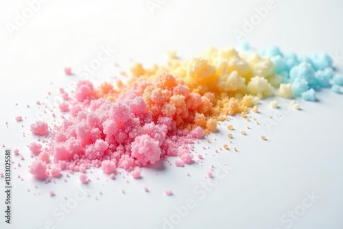 Scattered sugar crystals on white backdrop High key lighting , powder, high key, minimal