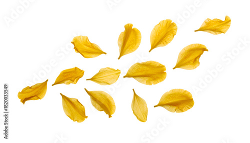 Scattered yellow flower petals isolated on a white background, creating a dynamic and airy composition