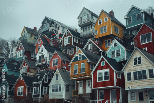 Scene showing a row of townhouses stacked on top of each other haphazardly, defying gravity and appearing unstable,