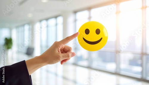 Scene with finger pointing at bright yellow smiling face emoji