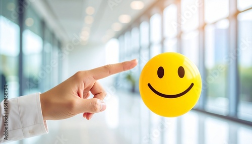Scene with finger pointing at bright yellow smiling face emoji