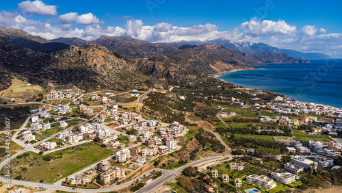 Scenic aerial shot of Paleochora and the coastline with the white mountains in crete, Greece