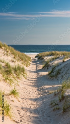 Scenic beach path through sand dunes to ocean background for invitation or card screensaver