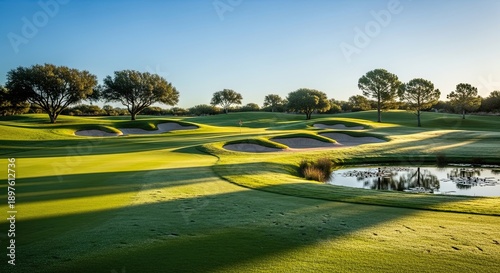 Scenic golf course landscape with green fairways sand traps and blue sky