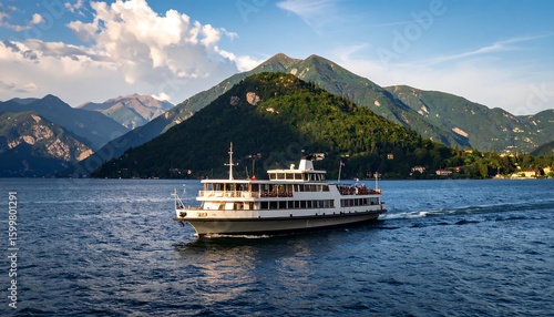 Scenic lake cruise ship on a serene mountain lake