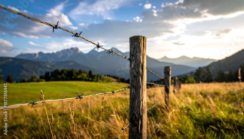 Scenic landscape with barbed wire fence and mountain backdrop.