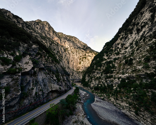 Scenic mountain gorge with a winding road and a turquoise river flowing between steep rocky cliffs.
