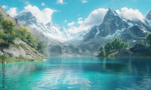 Scenic mountain lake with clear blue water reflecting the snow-capped peaks, peaceful and serene atmosphere, bright natural tones,