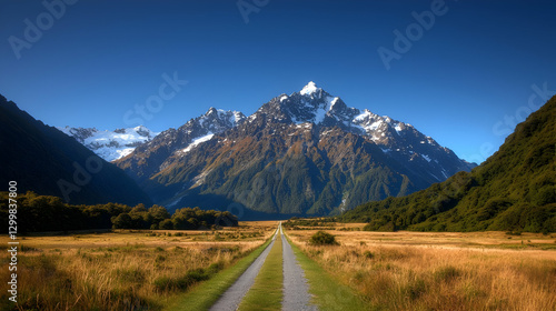 Scenic Mountain Landscape With Dirt Road Leading Through Valley Under Clear Blue Sky