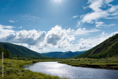 Scenic mountain river landscape under blue sky with fluffy clouds