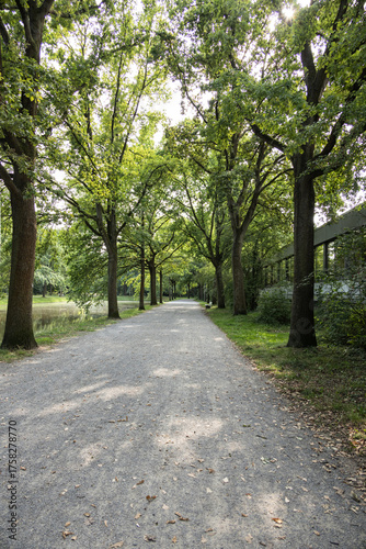 Scenic park pathway surrounded by tall trees and summer greenery under bright sunlight