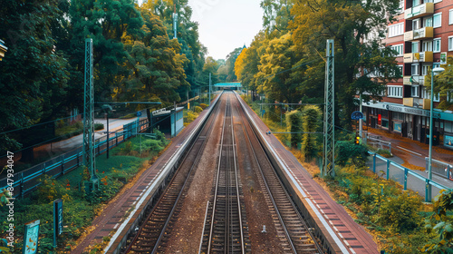 Scenic railway station with tracks surrounded by greenery and buildings