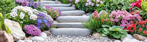 Scenic spring garden pathways adorned with blooming flowers and lush foliage, spring garden pathways, tranquil floral walkway
