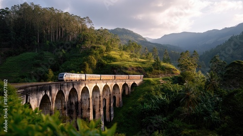 Scenic Train Journey Through Lush Green Hills and Majestic Mountains at Sunset