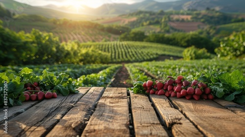 Scenic view of a countryside farm with freshly harvested radishes on wooden boards, surrounded by lush green fields and hills at sunrise.