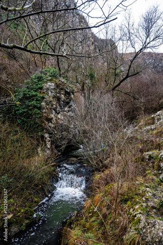 Scenic view of a little waterfall flowing into a stream amidst rocks and lush vegetation in tureni gorges, cluj county, romania