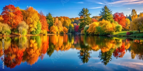 Scenic view of colorful autumn trees reflected in a tranquil lake in the park , Fall foliage, leaves, autumn colors, reflection