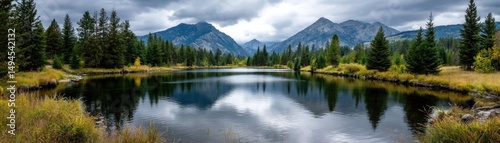 Scenic view of lake in pine forest with tree and rock concept. Stunning mountain scenery reflecting in a serene lake.