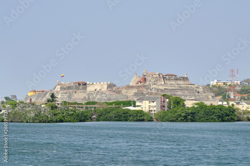 Scenic view of San Felipe fortress (Castillo de San Felipe de Barajas) in Cartagena de Indias - old historical town in Colombia. Beautiful summer sunny look of colonial fortress in South America