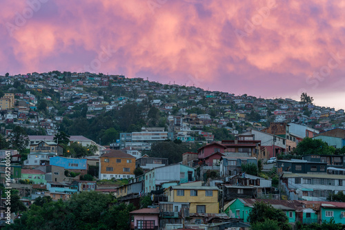 Scenic view of the sprawling, colorful hillside neighborhoods of Valparaiso, Chile, illuminated by the soft pastel colors of a twilight sky.