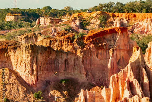 Scenic view of tourists dwarfed by rock formations at Marafa Depression - Hell's Kitchen at sunset in Malindi, Kenya