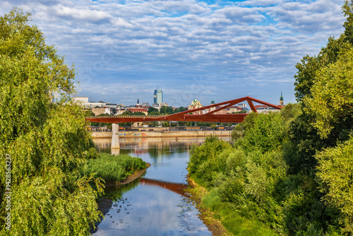 Scenic view of Warsaw skyline with Vistula River and bridge