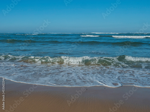 Scenic view turquoise blue breaking sea waves with white foam approaching the golden sand beach at wild Rota Vicentina coast at Portugal. Atlantic ocean vawes with blue sky at sunny autumn day