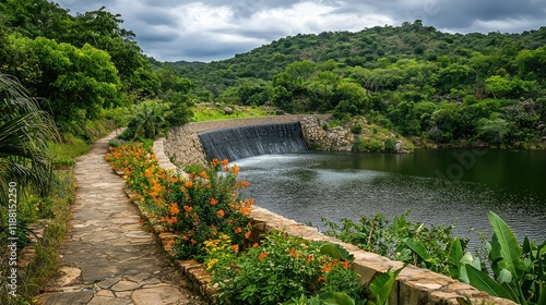 Scenic Waterfall Surrounded by Lush Greenery and Vibrant Flowers