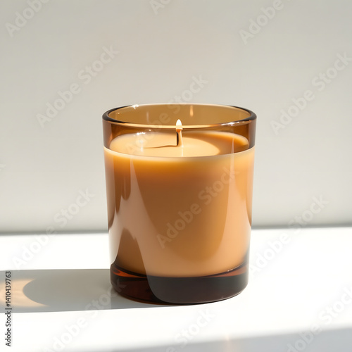 Scented candle in amber glass on white surface.