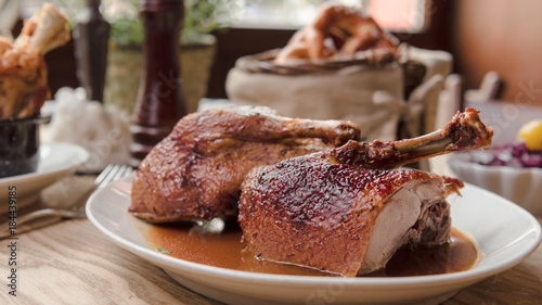 Schöne knusprige Weihnachts-Ente aus dem Ofen mit Knödel, Blaukraut und Brezn