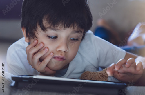 School kid in self isolation using tablet for homework,Child sad face lying down on sofa looking deep in thought,Boy bored stay at home during covid lock down,Social Distance learning online education