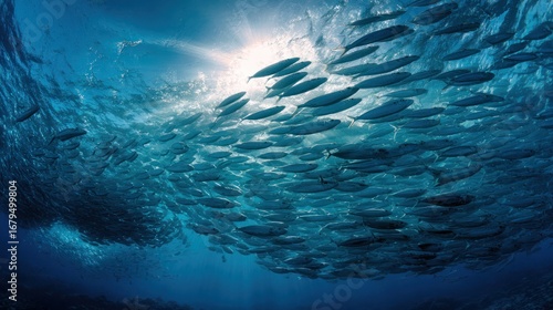 School of fish swims under bright water surface with sun's rays streaming down