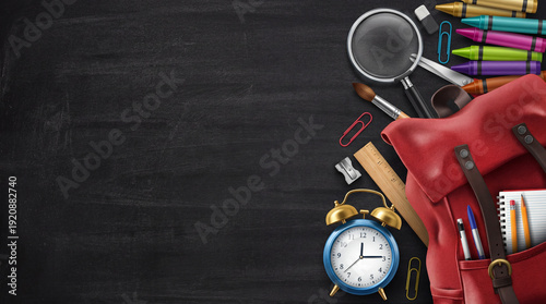 School supplies organized neatly on a dark chalkboard background ready for learning