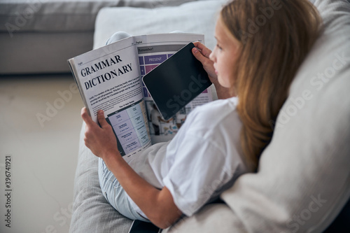 Schoolgirl hiding a tablet behind a textbook
