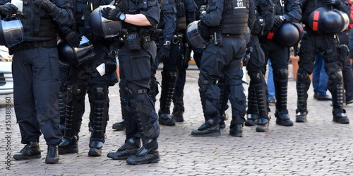 Schwarz uniformiertes Polizeiaufgebot in voller Ausrüstung auf einer Demo