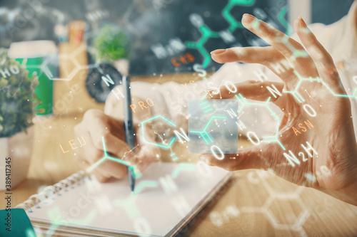 Science formula hologram over woman's hands taking notes background. Concept of study. Double exposure
