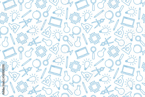 science seamless pattern with microscope, magnifier, pencil, pen, test tube, microprocesor, bulb, compass, globe icons - vector illustration