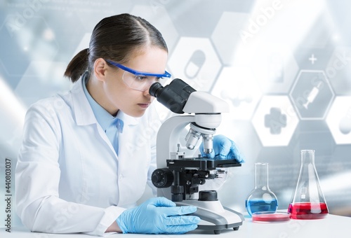 Science technology concept. Scientific examination. A scientist with a microscope