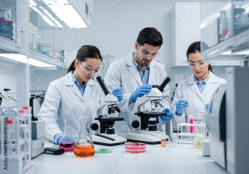 Scientific research collaboration in laboratory setting experimenting with microscopes professional environment close-up view