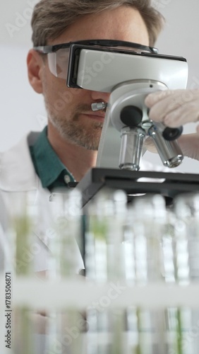 Scientific researcher in protective gear analyzing specimens through a microscope in a sterile laboratory environment. Medicine, healthcare and science concept