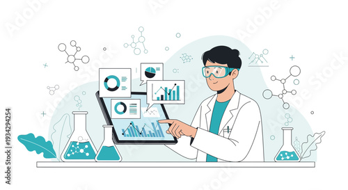 Scientist Analyzing Data on Tablet with Lab Equipment and Molecular Structures