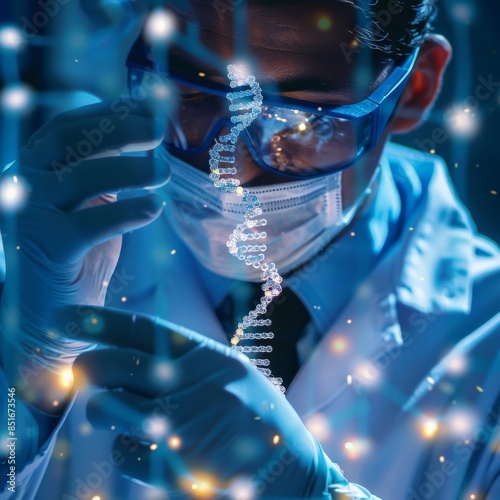 Scientist examining DNA Molecule with advanced technology in a futuristic lab environment.