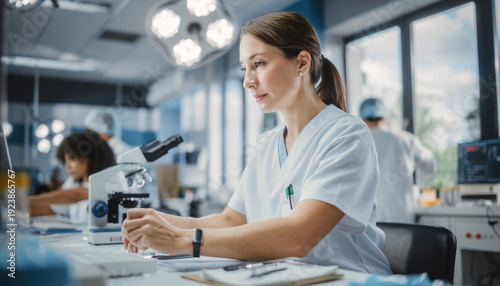 Scientist examining samples through a microscope in a modern laboratory setting with colleagues working in the background